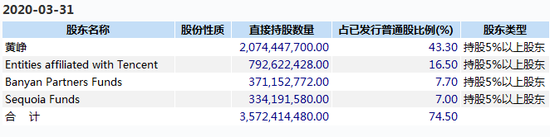 不过,上市两年多后,拼多多股权结构有所变化,部分投资机构退出。截至2020年3月31日,wind显示,黄峥个人仍持有43.3%股权,其次是腾讯通过旗下投资公司持有16.5%股权,以及红杉资本持有7%股权。